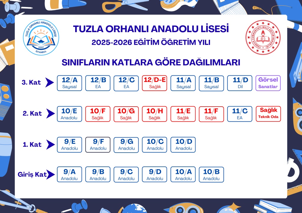 Tuzla Orhanlı Anadolu Lisesi olarak 2025-2026 eğitim-öğretim yılında sınıflarımızın okul katlarımıza göre yerleşim planı belirlenmiştir. Öğrencilerimizin derslere erişimini kolaylaştırmak ve eğitim ortamını düzenli bir şekilde sürdürmek amacıyla yapılan bu yerleşim planı aşağıdaki gibidir: