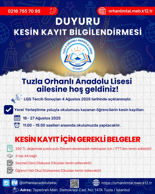 Tuzla Orhanlı Anadolu Lisesi'ne Yerleşen Öğrencilerimizin Kesin Kayıt İşlemleri