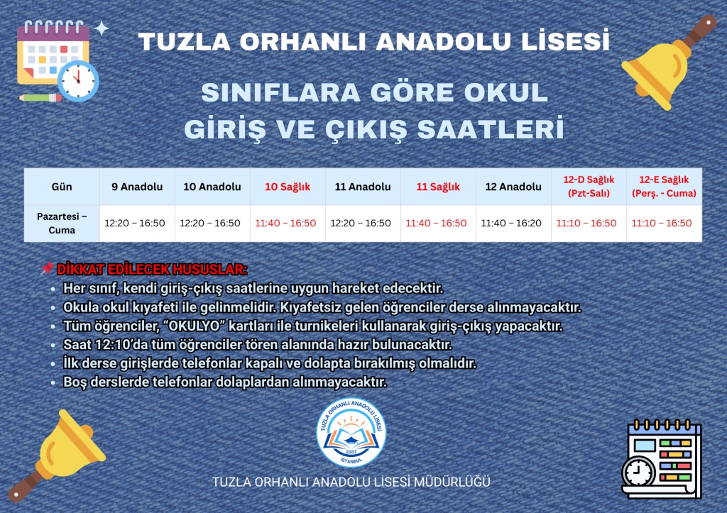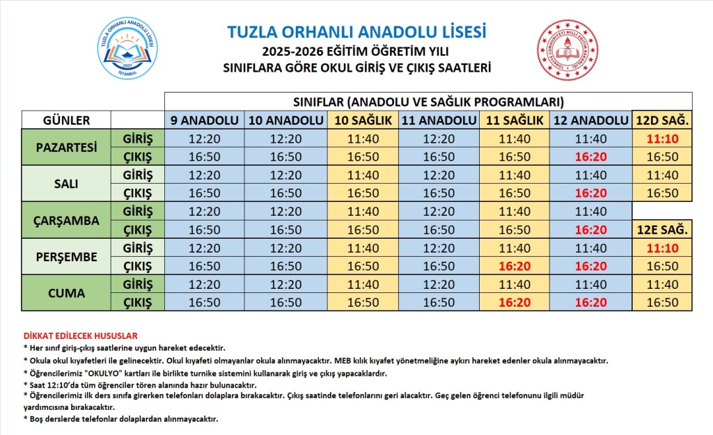 2025-2026 Eğitim-Öğretim yılında okulumuzda uygulanacak sınıflara göre giriş ve çıkış saatleri aşağıda belirtilmiştir. Öğrencilerimizin derslere zamanında katılabilmesi ve eğitim-öğretim sürecinin düzenli ilerleyebilmesi için belirtilen saatlere titizlikle uyulması gerekmektedir.
